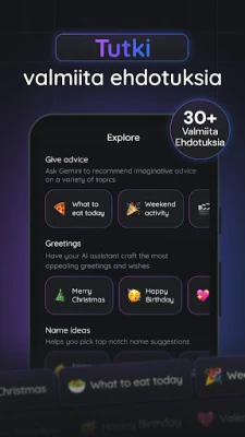 Gemmyn käyttöliittymä on suunniteltu intuitiiviseksi ja saumattomaksi, tehden edistyneen tekoälyn hyödyntämisestä vaivatonta. Selaa vaivattomasti valmiita komentoja, jotka kattavat kaiken lasten nimeämisideoista sosiaalisen median sisällön suunnitteluun. Esitä kysymyksiä ja saat välittömiä, tarkkoja vastauksia kaikkiin arjen pulmiin tai syvällisempiin pohdintoihin. Dynaamiset keskustelut tekoälykumppanin kanssa tekevät ideoinnista ja oppimisesta interaktiivista. Lisäksi Gemmy mahdollistaa ideoiden ja keskusteluhistorian tallentamisen ja helpon jakamisen, edistäen yhteistyötä. Sisältökirjastoa päivitetään jatkuvasti, varmistaen, että löydät aina tuoreita ja relevantteja työkaluja tarpeisiisi, ja yksityisyytesi pysyy suojattuna kattavien turvatoimien ansiosta.