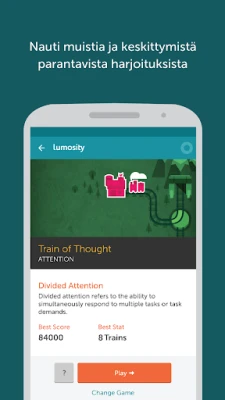 Lumosity kehittää muistia ja keskittymiskykyä yli 25 kognitiivisen pelin avulla. Koe henkilökohtainen aivoharjoittelu, joka mukautuu tasoosi ja tarjoaa aina sopivasti haastetta. Yli 70 miljoonan käyttäjän maailmanlaajuisesti luottama ohjelma.