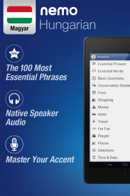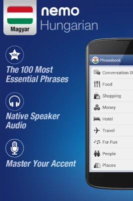 Nemo on suunniteltu aloittamaan unkarin hyödyllisimpien sanojen puhuminen välittömästi ja itsevarmasti. Miljoonat käyttäjät ovat jo hyötyneet Nemon tehokkaasta menetelmästä. Opi sujuvasti omalla Android-laitteellasi.