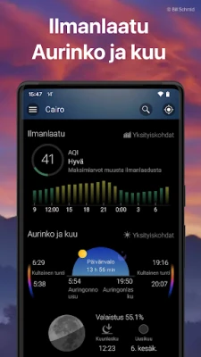Weawow tarjoaa poikkeuksellisen kattavat säätiedot ilman ainuttakaan häiritsevää mainosta. Valitse useista luotettavista säätietopalveluista, kuten NWS, Meteo France ja Dark Sky, varmistaaksesi aina tarkimmat ja ajantasaisimmat ennusteet. Sukella syvälle yksityiskohtiin: tarkista lämpötila, sademäärä, tuulen nopeus ja puuskat, ilmanpaine, kastepiste, ilmankosteus, pilvisyys, UV-indeksi, näkyvyys ja jopa kuun vaiheet tai auringonnousu- ja laskuajat. Mukauta käyttöliittymä täysin omaksesi – järjestele tiedot haluamaasi järjestykseen, valitse mieluisimmat sääsymbolit ja vaihda vaalean ja tumman teeman välillä luodaksesi juuri sinulle sopivan näkymän.